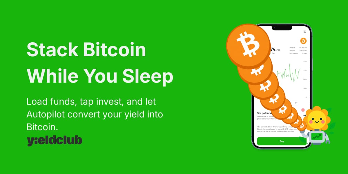 YieldClub puts your savings on autopilot, depositing into a yield account that automatically converts earnings into Bitcoin around the clock. No charts, no timing the market, no minimums.